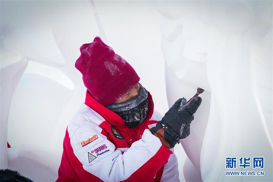 當(dāng)日,“冰城”哈爾濱氣溫低至零下20攝氏度左右,正在參加第二十五屆哈爾濱國(guó)際雪雕比賽的選手們冒著嚴(yán)寒進(jìn)行創(chuàng)作。