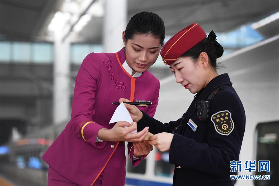 吉如(左)將盲人旅客吳瀟護(hù)送上車后,與列車長進(jìn)行交接(1月15日攝)。 新華社記者 陶明 攝