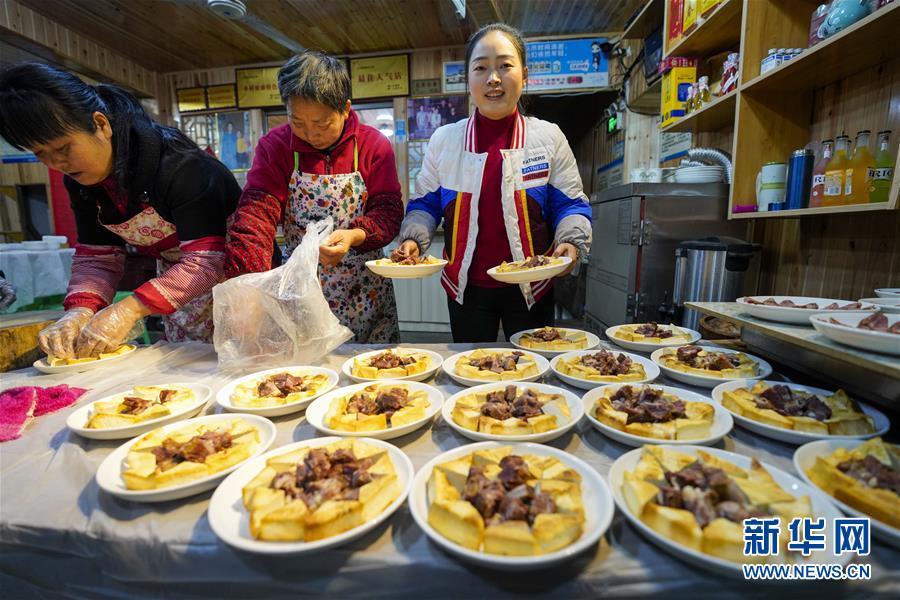 重慶江津區(qū)中山古鎮(zhèn)第十四屆 “千米長(zhǎng)宴”民俗文化節(jié)盛大啟幕。上午10時(shí),中山古鎮(zhèn)老街人聲鼎沸,窄窄的青石板路打掃得干干凈凈,家家戶(hù)戶(hù)門(mén)口掛起喜慶的紅燈籠,老商鋪門(mén)口擺滿(mǎn)了米酒、烤糍粑、煙熏豆腐……此次“千米長(zhǎng)宴”以“絲路情緣,‘埃’上中山”為主題?!扒组L(zhǎng)宴”期間,游客們不僅可以一雙筷子吃遍全街,還可欣賞到祈福祭祀、民俗拜年、“打盆上菜”等表演,同時(shí)還增設(shè)了以唱、跳、講故事的上菜方式情景演繹愛(ài)情主題的文化餐飲,展示富硒愛(ài)情宴的文化內(nèi)涵。圖為街坊們?cè)陬^天就開(kāi)始準(zhǔn)備各種菜肴與小吃。