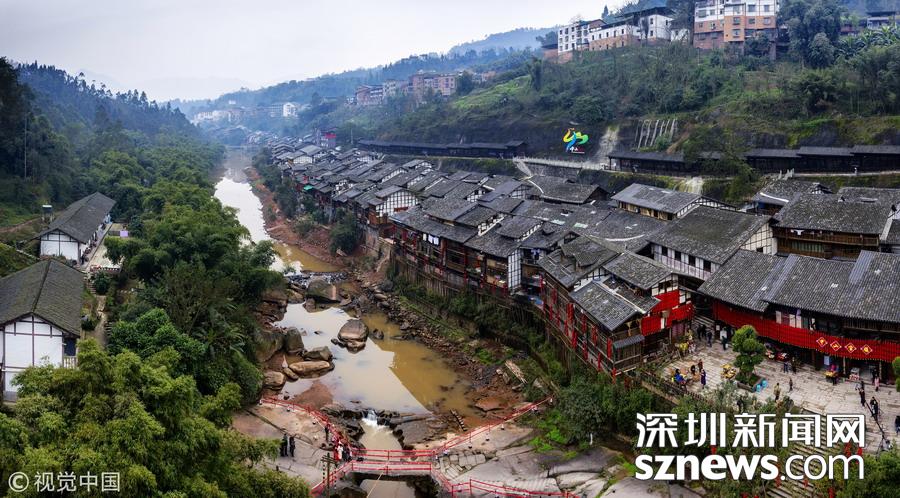 2019年1月26日,重慶中山古鎮(zhèn),880桌“千米長(zhǎng)宴”5萬(wàn)人共品年味。夜幕下的中山古鎮(zhèn),燈光璀璨,流水潺潺。