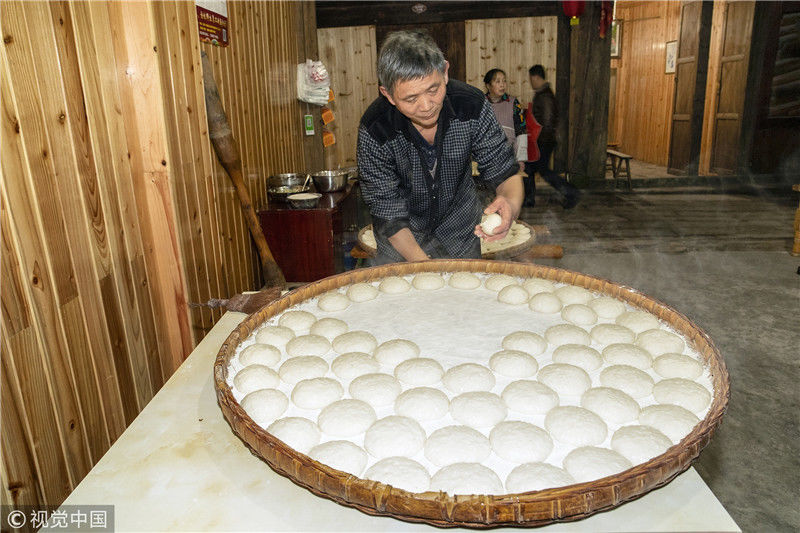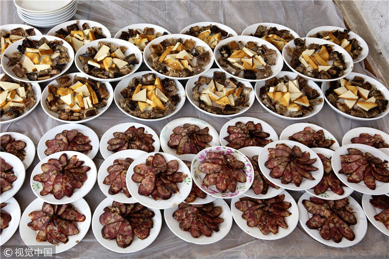 2019年1月26日,重慶中山古鎮(zhèn),880桌“千米長(zhǎng)宴”5萬(wàn)人共品年味。街坊們?cè)陬^天就開(kāi)始準(zhǔn)備各種菜肴與小吃。
