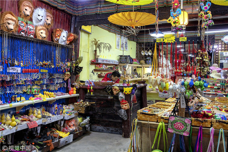 2019年1月26日,重慶中山古鎮(zhèn),880桌“千米長(zhǎng)宴”5萬(wàn)人共品年味。古鎮(zhèn)居民們編制的竹編制品。