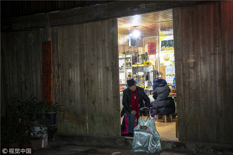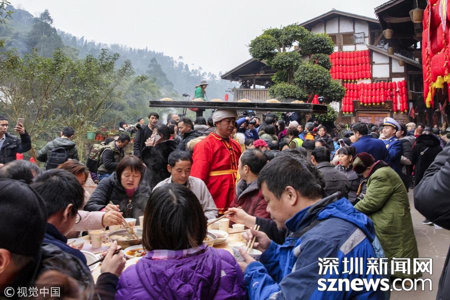 2019年1月26日,重慶中山古鎮(zhèn),880桌“千米長(zhǎng)宴”5萬(wàn)人共品年味。當(dāng)?shù)刳s來(lái)的村民。