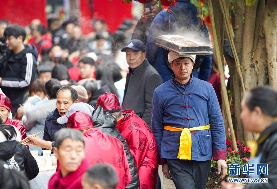1月18日,在中山古鎮(zhèn)的“千米長(zhǎng)宴”上,民間藝人用古鎮(zhèn)傳統(tǒng)“打盆”絕藝給游客們上菜。新華社記者劉潺攝
