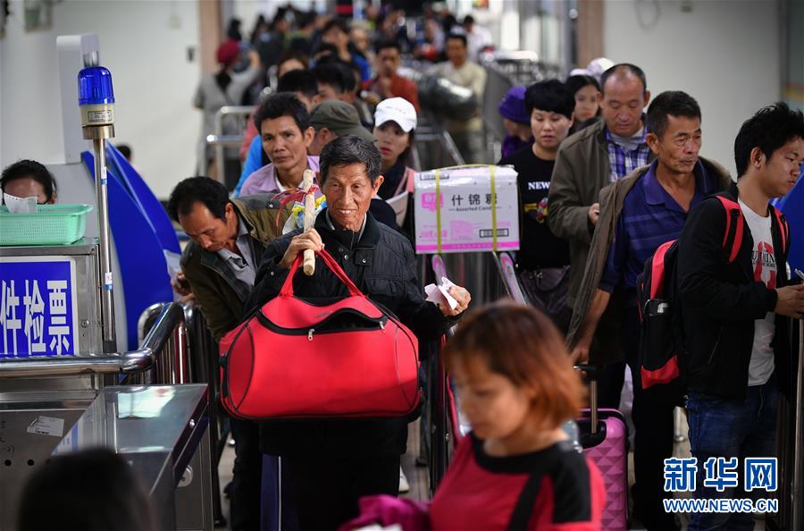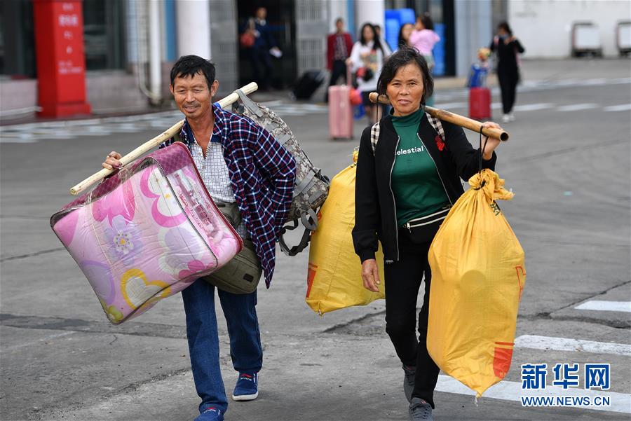 1月19日,來自湖南的務(wù)工人員在??谛阌⒏圯喍纱a頭登船返鄉(xiāng)。 新華社記者 郭程 攝