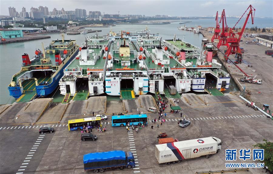 1月19日在海口秀英港輪渡碼頭拍攝的在裝船的客滾輪(無人機(jī)照片)。 新華社記者 郭程 攝