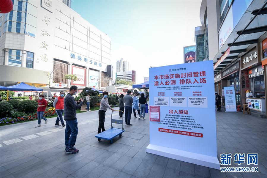 2月24日,在深圳華強(qiáng)北的華強(qiáng)電子世界門(mén)外,商戶排隊(duì)等待進(jìn)入市場(chǎng)。 新華社記者 毛思倩 攝