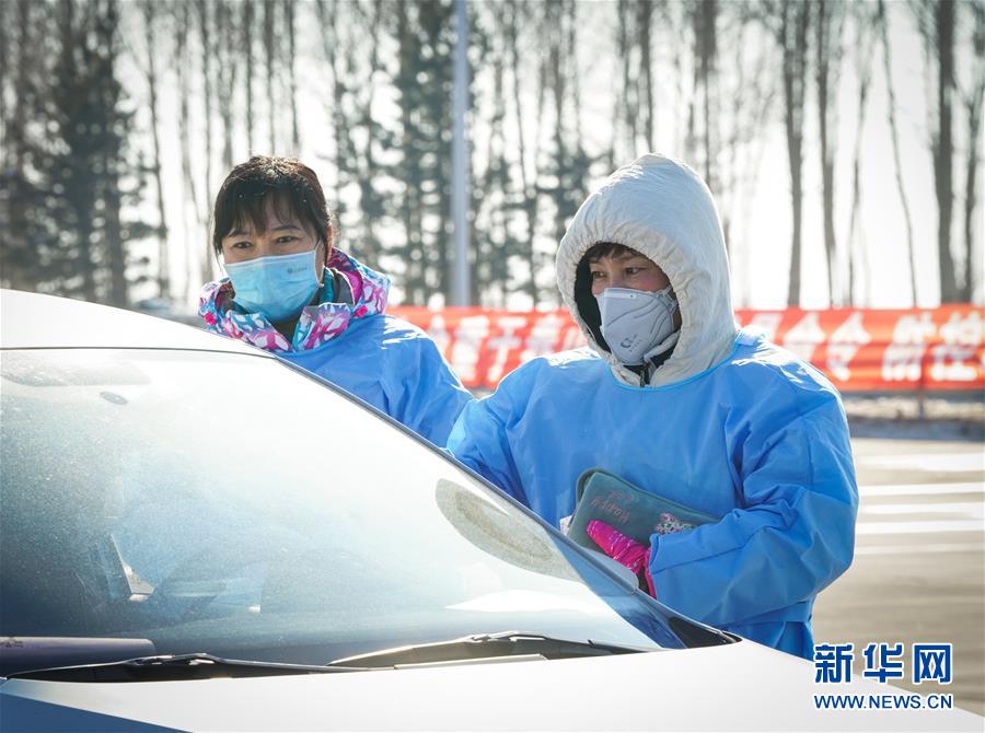 2月24日,工作人員在哈同高速公路哈爾濱收費站為車輛人員登記、測體溫。 新華社記者 王松 攝