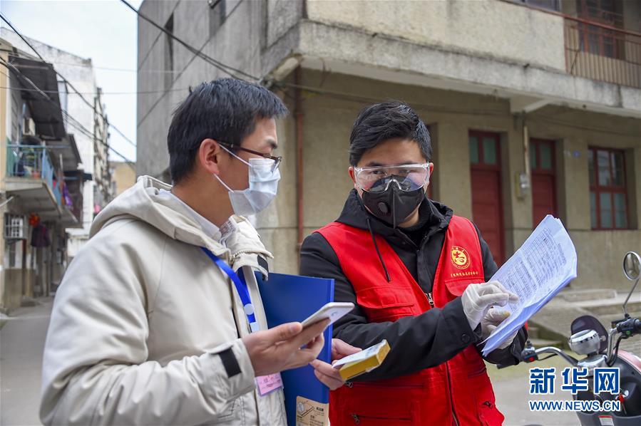 書院社區(qū)志愿者梁尚(中)在登記居民代購藥品信息(2月23日攝)。 新華社記者 胡虎虎 攝