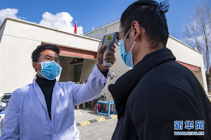西藏大學(xué)醫(yī)學(xué)院預(yù)防專業(yè)本科生次成郎加(左)在學(xué)校門口為來(lái)校者測(cè)量體溫(2月23日攝)。新華社記者孫非攝