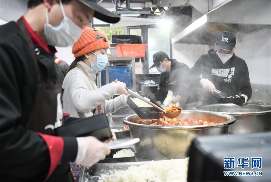 2月26日,劉女士(左二)和伙計們在分裝盒飯。新華社記者程敏攝