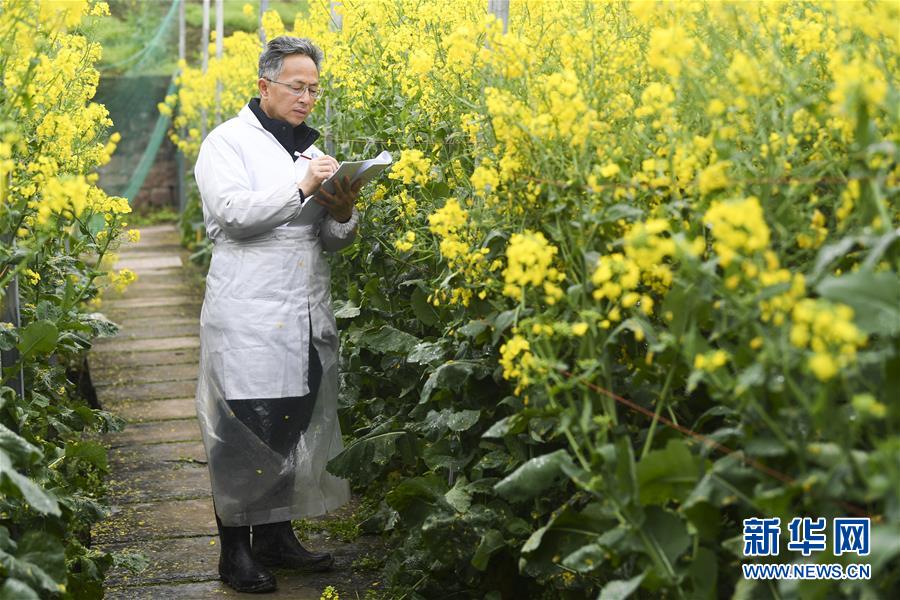 3月5日,重慶市油菜工程技術研究中心負責人李加納教授在觀察記錄油菜生長情況。時下正值油菜花期,重慶市油菜工程技術研究中心的農學專家?guī)ьI學生和技術工人搶抓農時,推進油菜科研和育種工作。新華社記者 王全超 攝