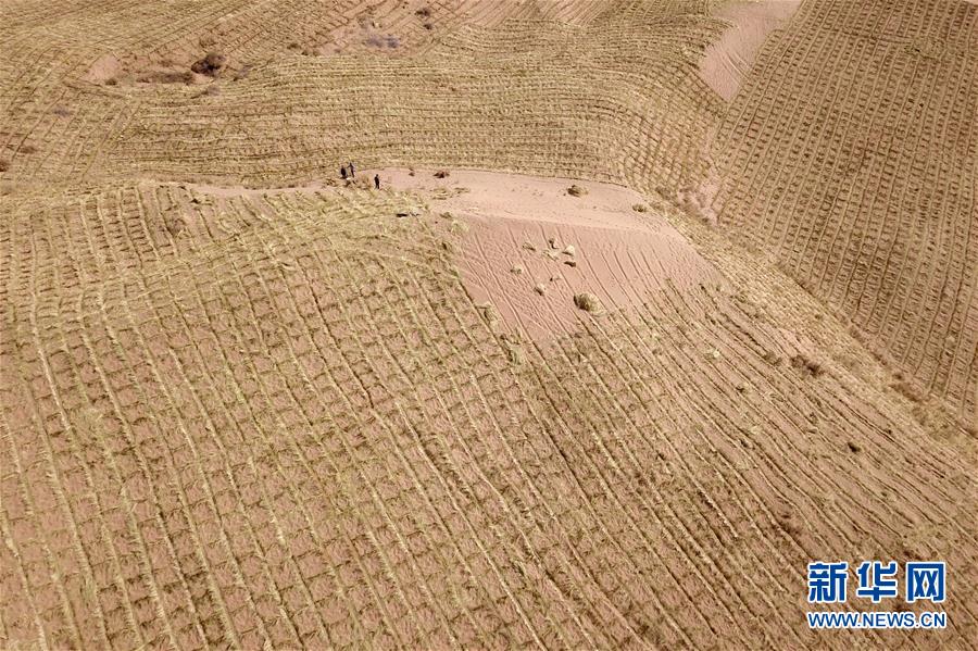 3月5日,在古浪縣北部沙區(qū)旱麻崗治沙點(diǎn),群眾扎草方格壓沙(無(wú)人機(jī)照片)。初春時(shí)節(jié),在騰格里沙漠南緣的甘肅省武威市古浪縣,當(dāng)?shù)馗刹柯毠ぜ鞍瞬缴沉謭?chǎng)治沙人共同在縣城北部沙區(qū)旱麻崗治沙點(diǎn)開(kāi)展春季治沙勞動(dòng)。新華社記者 范培珅 攝