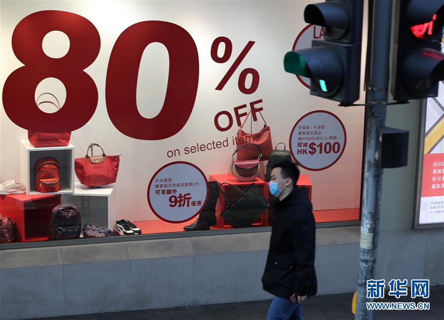 在香港中環(huán),市民戴著口罩從商店櫥窗前經(jīng)過(guò)(2月22日攝)。新華社記者李鋼攝