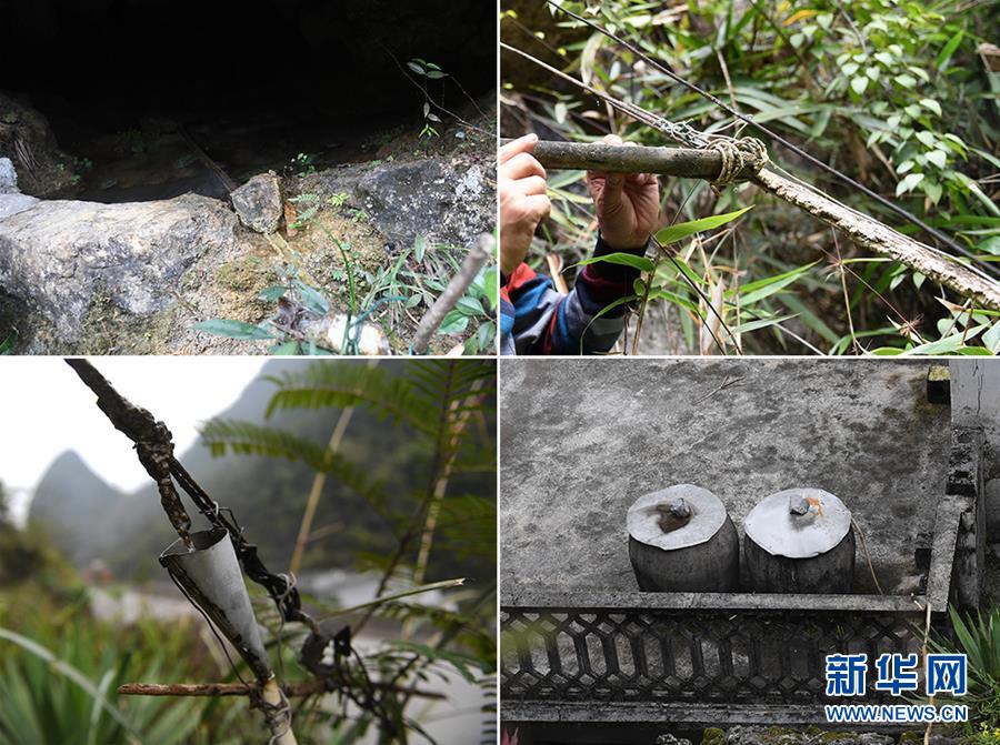 這張拼版圖片顯示廣西都安瑤族自治縣澄江鎮(zhèn)自成村加倫屯村民黃景飛獨創(chuàng)的“鐵線引水”法(2018年3月16日攝)。左上圖為竹枧將山泉水從山洞引出;右上圖為竹枧將山泉水引到鐵線上;左下圖為一個特制的漏斗將水接入膠管里;右下圖為膠管將山泉水送到水缸里。廣西有近一半貧困人口生活在石漠化地區(qū),涉及數(shù)十個縣區(qū)。這里也是廣西飲水保障程度最低的地區(qū),解決貧困人口飲水問題是廣西脫貧攻堅戰(zhàn)“硬仗中的硬仗”?!笆濉币詠恚瑥V西加快實施農(nóng)村飲水安全鞏固提升工程。因地制宜,采取新建、擴建及管網(wǎng)延伸等多種措施,補齊貧困地區(qū)水利薄弱短板,進一步提升石漠化地區(qū)群眾飲水安全保障水平,助推脫貧攻堅。新華社記者陸波岸攝