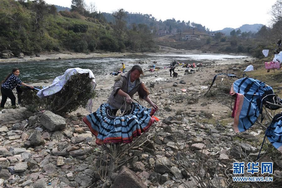 廣西南丹縣里湖瑤族鄉(xiāng),村民在河邊洗衣并就地晾曬(2018年1月12日攝)。廣西有近一半貧困人口生活在石漠化地區(qū),涉及數(shù)十個縣區(qū)。這里也是廣西飲水保障程度最低的地區(qū),解決貧困人口飲水問題是廣西脫貧攻堅戰(zhàn)“硬仗中的硬仗”?!笆濉币詠?,廣西加快實施農(nóng)村飲水安全鞏固提升工程。因地制宜,采取新建、擴建及管網(wǎng)延伸等多種措施,補齊貧困地區(qū)水利薄弱短板,進一步提升石漠化地區(qū)群眾飲水安全保障水平,助推脫貧攻堅。新華社記者周華攝