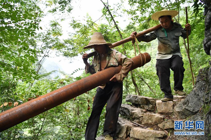 在廣西大化瑤族自治縣板升鄉(xiāng)弄雷村,工人們抬著抗旱飲水工程的水管在山路上前行(2016年8月10日攝)。廣西有近一半貧困人口生活在石漠化地區(qū),涉及數(shù)十個縣區(qū)。這里也是廣西飲水保障程度最低的地區(qū),解決貧困人口飲水問題是廣西脫貧攻堅戰(zhàn)“硬仗中的硬仗”?!笆濉币詠恚瑥V西加快實施農(nóng)村飲水安全鞏固提升工程。因地制宜,采取新建、擴建及管網(wǎng)延伸等多種措施,補齊貧困地區(qū)水利薄弱短板,進一步提升石漠化地區(qū)群眾飲水安全保障水平,助推脫貧攻堅。新華社記者黃孝邦攝