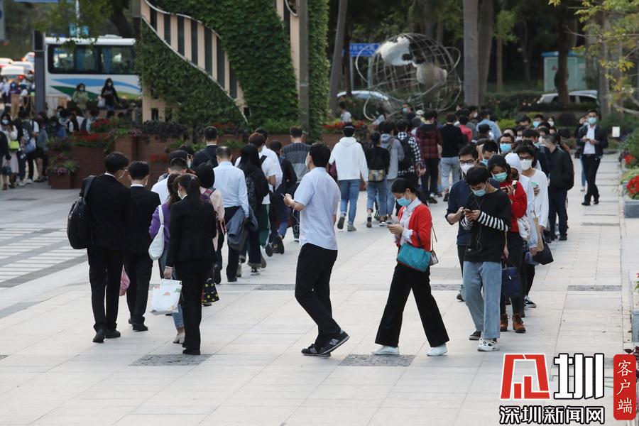 據(jù)悉,深圳地鐵實行客流管控,控制車站人員密度。由于下班高峰客流量較大,“人龍”排到一旁的科技園文化廣場,形成“蛇餅”隊伍,秩序卻十分井然。