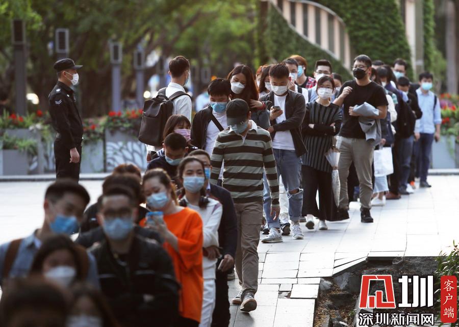 見圳客戶端·深圳新聞網(wǎng)2020年3月19日訊 下班時間,深圳地鐵一號線深大站A3出口外,下班后的市民在站外排大排長龍,依次有序進入地鐵站乘坐列車回家。