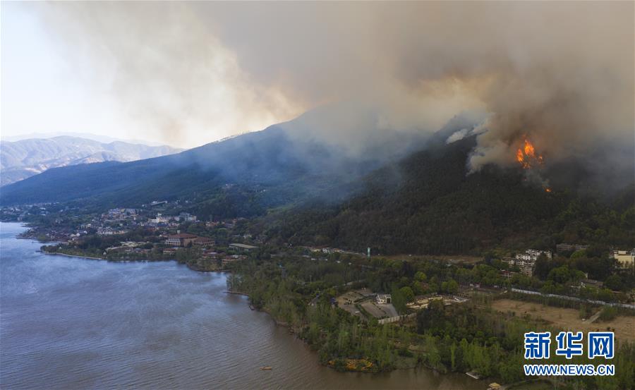 這是3月31日在四川省西昌市邛海畔拍攝的瀘山火場(chǎng)畫面。新華社記者惠小勇攝