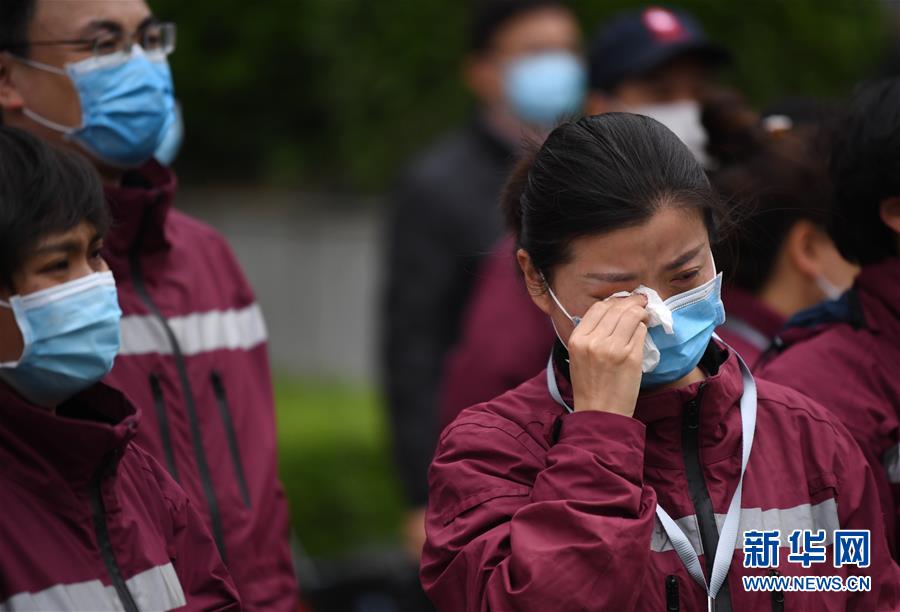 4月3日,來自西安交通大學(xué)第一附屬醫(yī)院的醫(yī)療隊(duì)隊(duì)員王沙沙(前)在送別“戰(zhàn)友”后落淚。 當(dāng)日,陜西省第一批援鄂醫(yī)療隊(duì)137名隊(duì)員在陜西省工人療養(yǎng)院結(jié)束了為期兩周的隔離休養(yǎng)。醫(yī)療隊(duì)員與“戰(zhàn)友”深情作別后,陸續(xù)踏上歸途。 新華社記者 李一博 攝