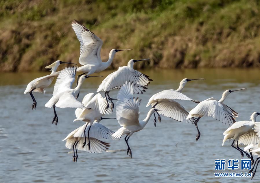 這是在福建閩江口濕地拍攝的黑臉琵鷺(4月12日攝)。新華社記者梅永存攝