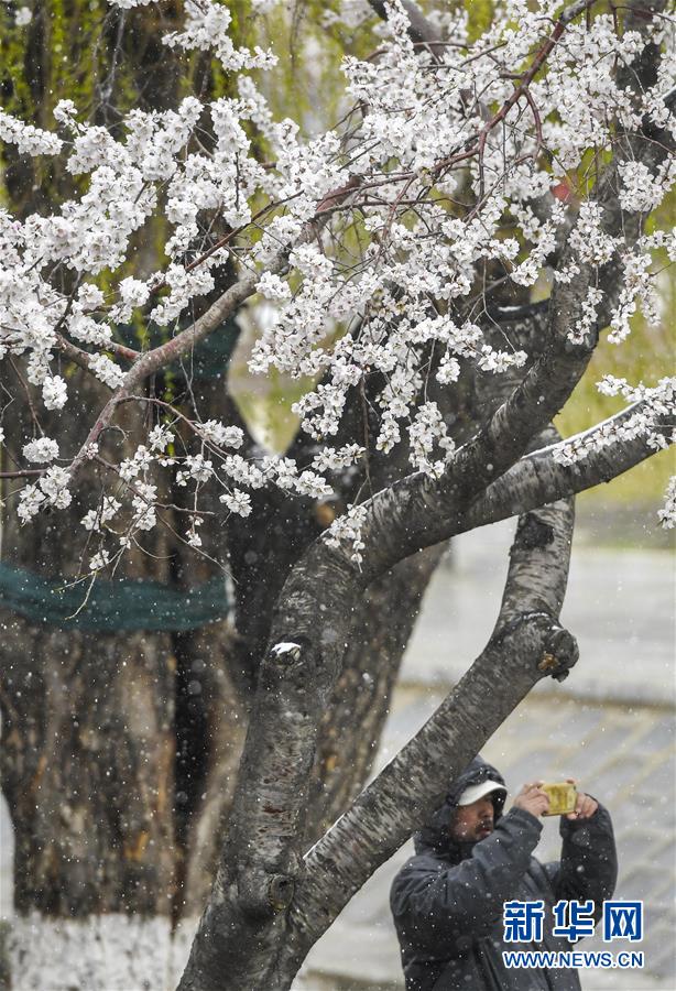 4月21日,市民在長春市杏花村公園拍攝雪景。當日,吉林省多地迎來降雪天氣。新華社記者許暢攝