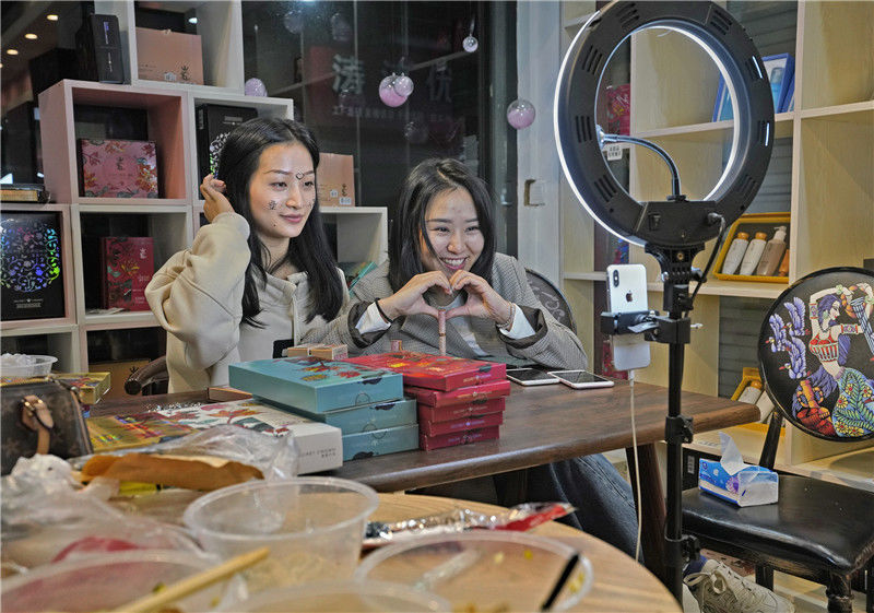 2019年11月10日,浙江金華,義烏北下朱村,倆主播在銷售化妝品,一個(gè)主播做出愛心的手型,對她們的“老鐵”(粉絲)示好。