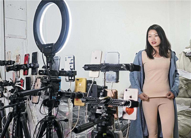 2019年11月9日,浙江金華,義烏北下朱村,倆主播在直播銷售保暖內(nèi)衣。