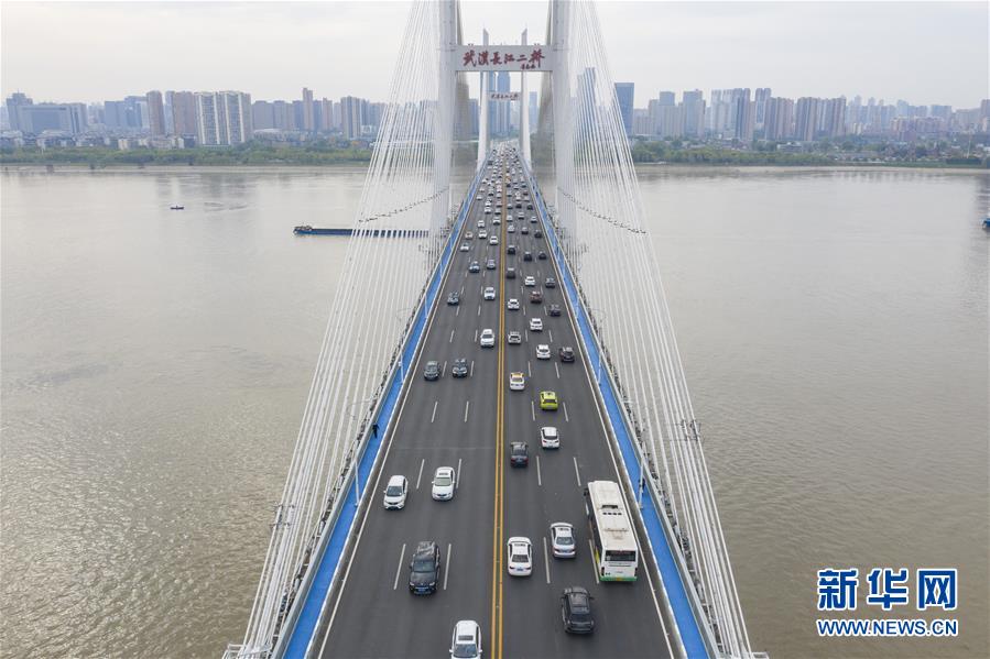4月14日,武漢長江二橋上車流如織(無人機照片)。新華社記者才揚攝