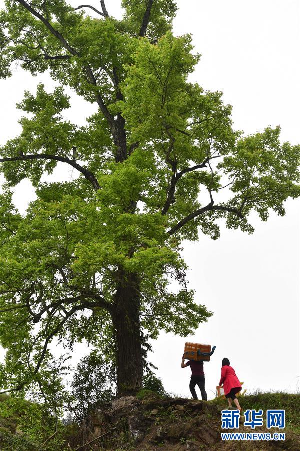 在廣西融水苗族自治縣縣城一處易地扶貧搬遷小區(qū)附近,45歲的楊美燕(左)和搬遷戶楊鮮花在農(nóng)場里護(hù)理果樹(3月13日攝)。