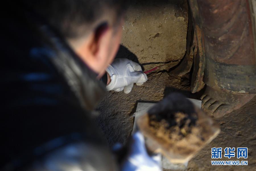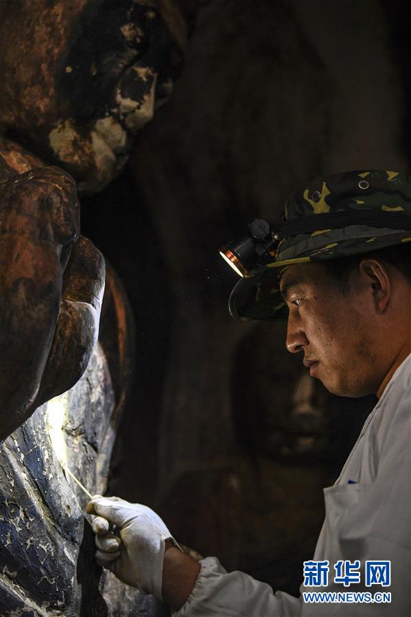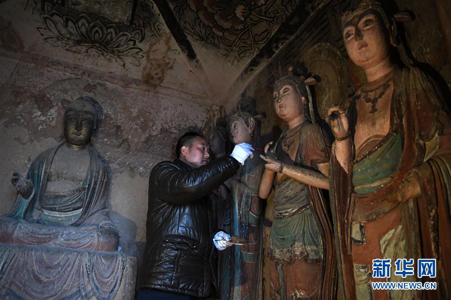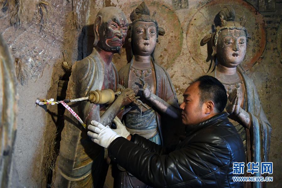 12月25日,在麥積山石窟第11窟,修復(fù)師牟常有對塑像破損處進(jìn)行加固處理。新華社記者馬寧攝