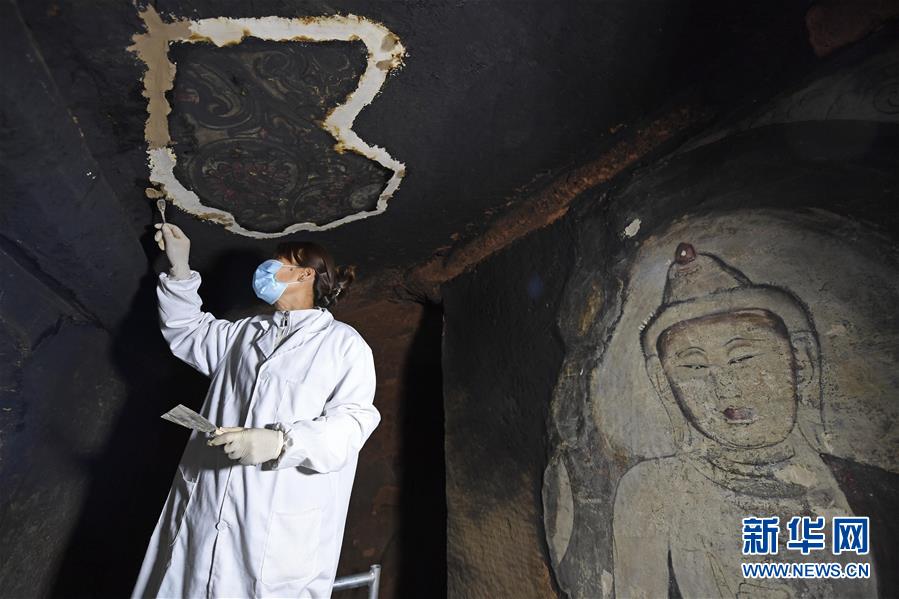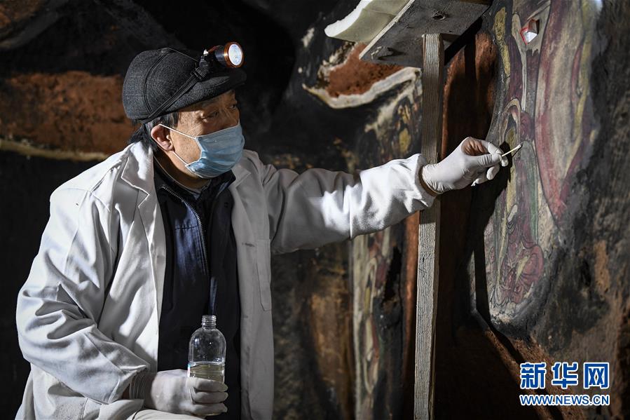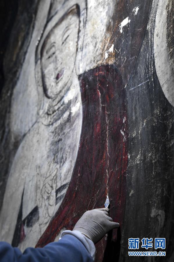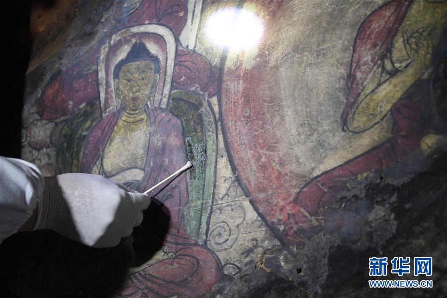 4月27日,文物修復(fù)專家在寧夏須彌山石窟圓光寺48號窟內(nèi)修復(fù)壁畫。新華社記者馮開華攝