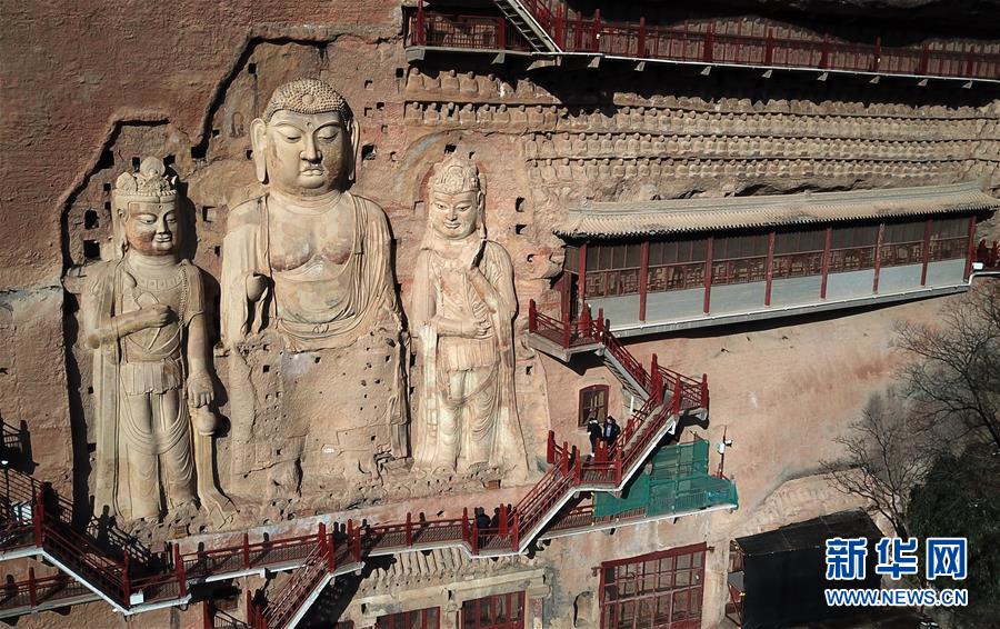 12月26日,游客在麥積山石窟參觀游覽(無人機拍攝)。新華社記者馬寧攝