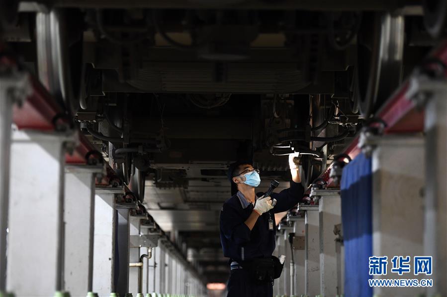 4月29日夜,合肥南動車運用所的工作人員對動車組進行檢修。每當夜深人靜的時候,合肥南動車運用所卻燈火通明,“動車安全守護者”們堅守崗位,對動車組進行全面細致檢修。新華社記者 劉軍喜 攝