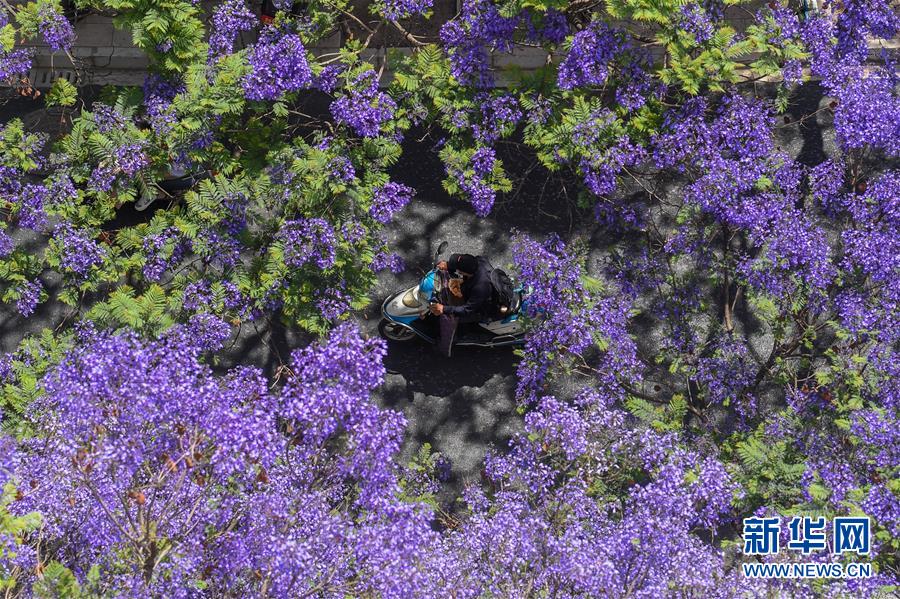 這是5月2日在昆明市桃源街拍攝的藍(lán)花楹。近日,云南省昆明市部分街區(qū)的藍(lán)花楹競相開放,為春城增添靚麗風(fēng)景。新華社記者藺以光攝