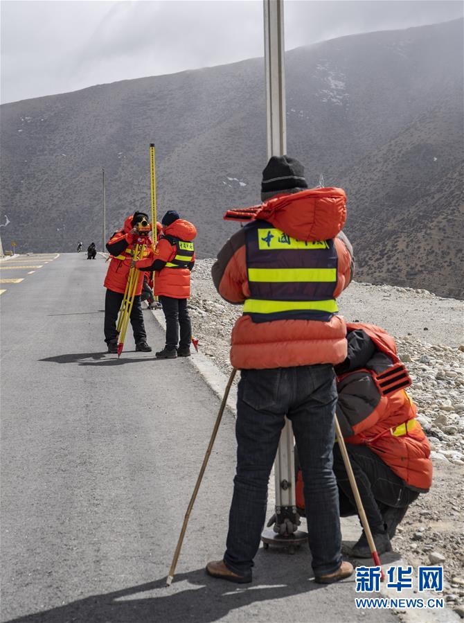 國(guó)測(cè)一大隊(duì)隊(duì)員在西藏定日縣曲當(dāng)鄉(xiāng)境內(nèi)進(jìn)行水準(zhǔn)測(cè)量(4月18日攝)。水準(zhǔn)測(cè)量是一種利用提供水平視線的儀器(如水準(zhǔn)儀、水準(zhǔn)標(biāo)尺),測(cè)定地面不同點(diǎn)之間的高差,并以此推算高度的一種方法,是經(jīng)典大地測(cè)量的重要技術(shù)之一。在目前正在進(jìn)行的2020珠峰高程測(cè)量中,部分國(guó)測(cè)一大隊(duì)隊(duì)員承擔(dān)了水準(zhǔn)測(cè)量的任務(wù)。新華社記者晉美多吉攝