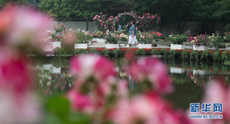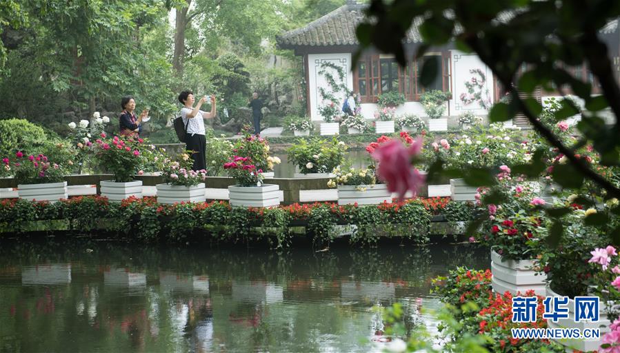 5月5日,游客在西湖畔的郭莊觀看月季花展。“五一”期間,第八屆杭州西湖月季花精品展在杭州西子湖畔舉行,展出國內(nèi)外700余個(gè)月季品種。新華社記者翁忻旸攝