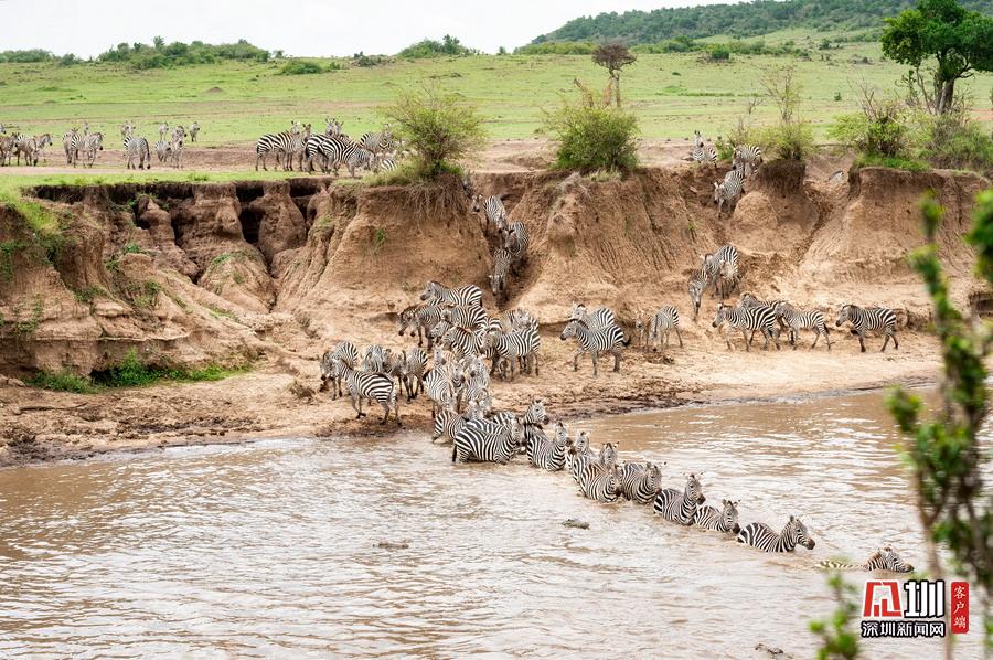 當時有超過1000只斑馬,正在河岸上等候合適的機會過河,它們快速低頭喝水后又迅速返回河岸。