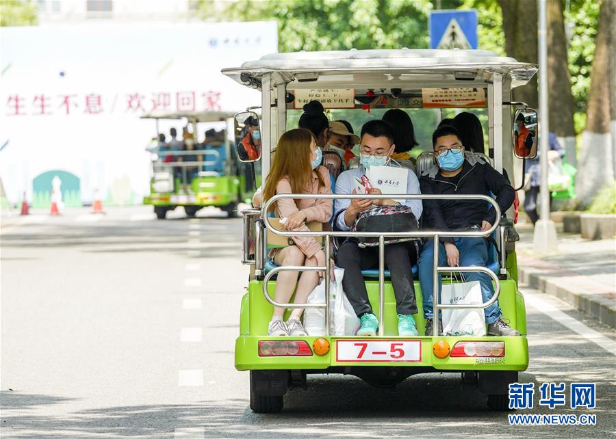 5月15日,在西南大學(xué)校園內(nèi),學(xué)生們搭乘校內(nèi)轉(zhuǎn)運(yùn)車前往各自的宿舍。當(dāng)日,重慶西南大學(xué)迎來疫情以來首批返校大學(xué)生。據(jù)介紹,按照疫情防控的需要,重慶市高校2020年春季學(xué)期從5月11日起按照“一校一策”原則,實行錯峰錯時分批次有序開學(xué)復(fù)課。新華社記者劉潺攝