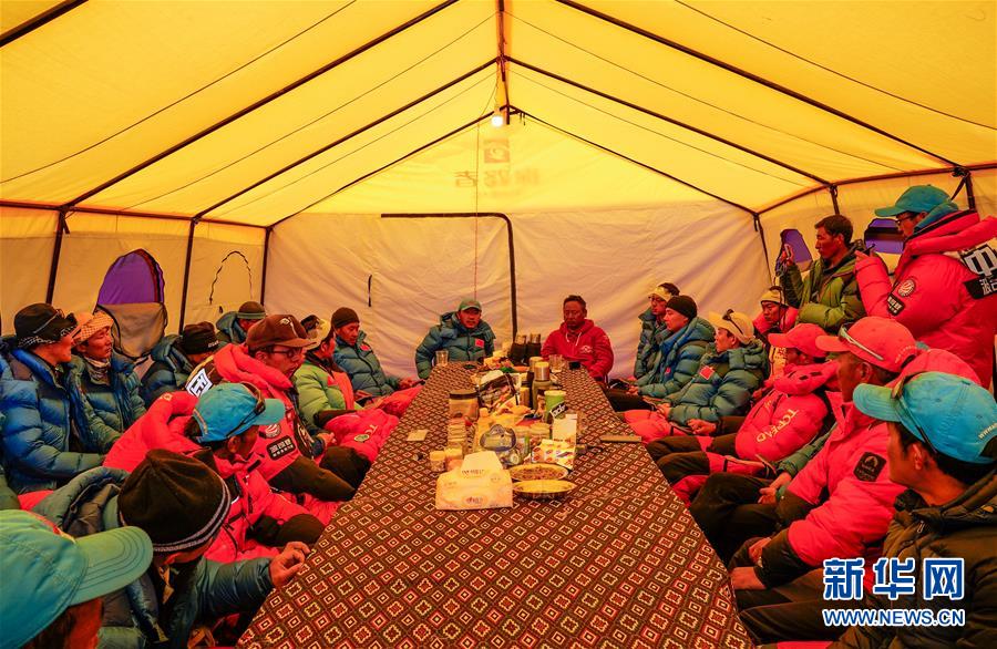 這是在海拔6500米的珠峰前進營地拍攝的公布2020珠峰高程測量12人沖頂隊員名單現(xiàn)場(5月18日攝)。新華社特約記者扎西次仁攝