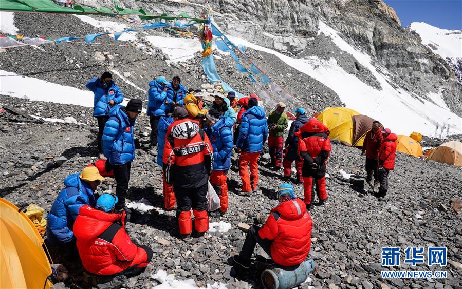 5月18日,沖頂隊(duì)員名單公布后,隊(duì)員們?cè)谶M(jìn)行相關(guān)準(zhǔn)備工作。新華社特約記者扎西次仁攝