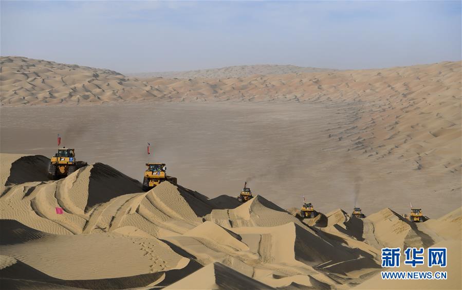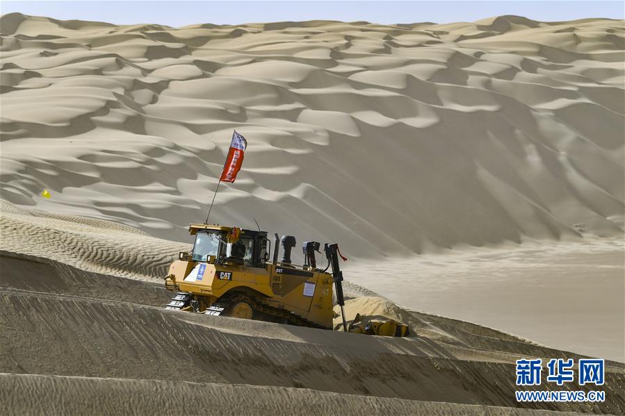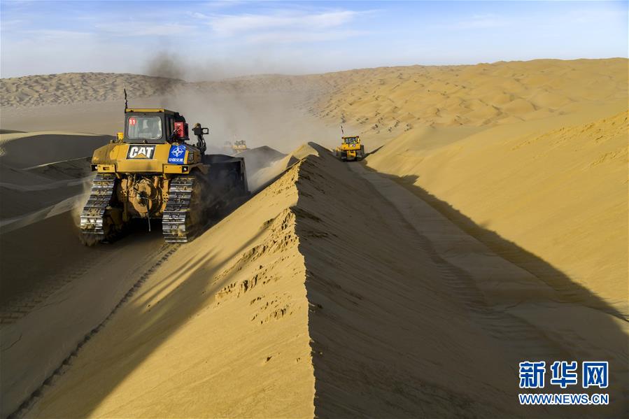 世界第二大流動沙漠——塔克拉瑪干沙漠東部腹地,風依舊在吹。極細的沙粒隨風飄蕩,無孔不入。新疆尉犁至且末沙漠公路施工現(xiàn)場仍是機器轟鳴,多臺大型推土機一字排開,將高聳的沙山緩緩推平。