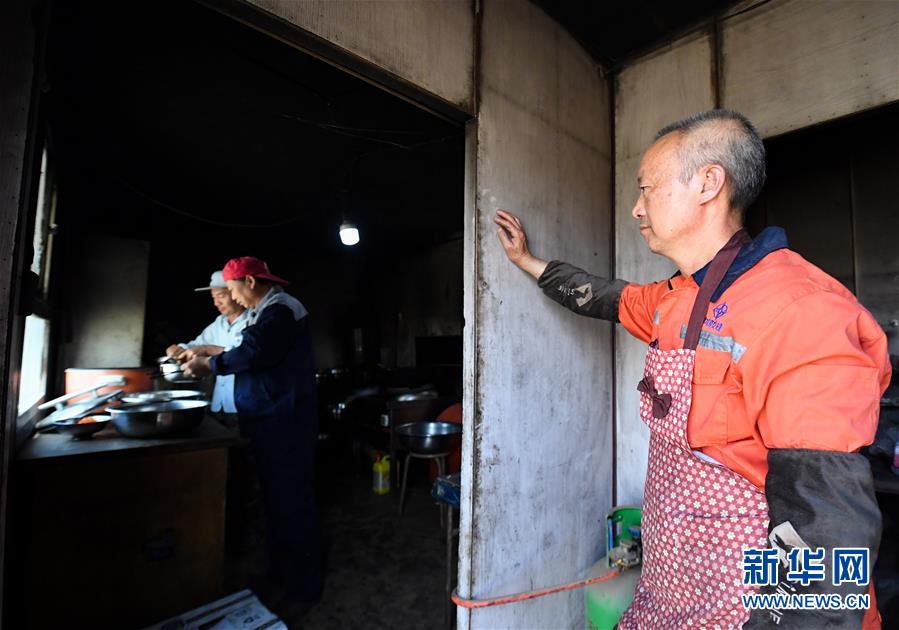 營地廚師楊云明在一旁看工友們取餐(5月16日攝)。因為營地僅有一個廚師,來自四川的楊云明自開工以來一直工作生活在營地里。新華社記者宋彥樺攝