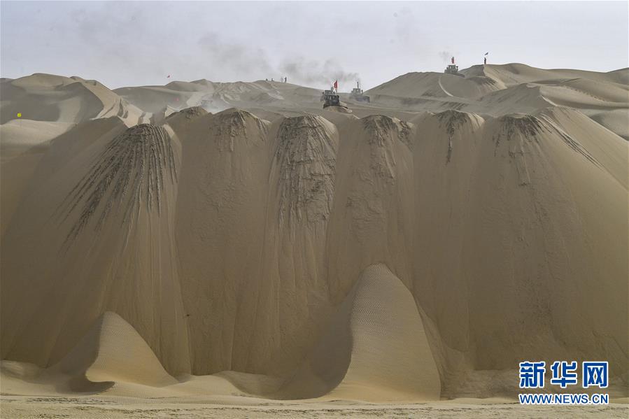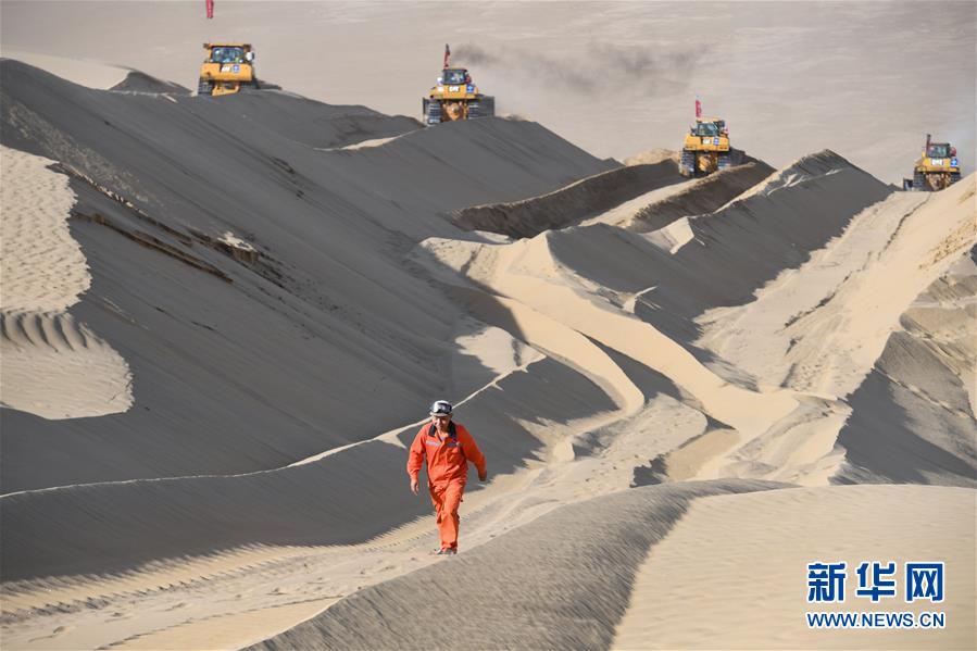 目前,參與施工的工人搶抓工期,有序推進,與風沙為伴,奮戰(zhàn)在茫茫沙海深處。為便于施工,工人們把營地搭建在沙山旁,吃住都在沙漠中。生活所需物資、機械設備所需油料等,均有人定期配送。