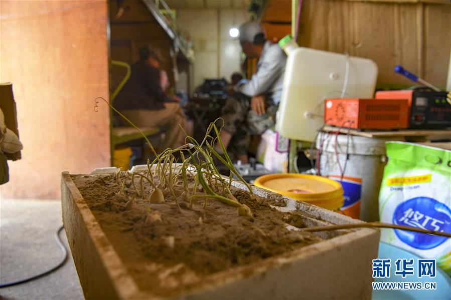 工人在營房內休息聊天,房內一角擺放著他們種植的小蒜苗(5月16日攝)。他們說,種蒜苗就是為了看看綠色植物。新華社記者胡虎虎攝