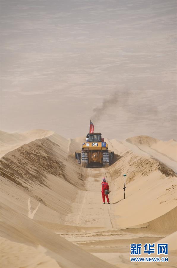 在新疆尉犁至且末沙漠公路施工現(xiàn)場,測繪員劉耀軍在沙山旁測量并標注施工線(5月17日攝)。新華社記者胡虎虎攝