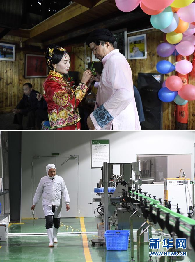 拼版照片上圖:婚禮開始前,吳春霞(左)為施六金佩戴胸花(2018年9月24日攝);下圖:施六金在十八洞村新建的山泉水廠里工作(2018年2月3日攝)。地處武陵山腹地的湖南湘西土家族苗族自治州花垣縣十八洞村曾深陷貧困。2013年,村里225戶中有136戶是貧困戶,40歲以上的“光棍兒”有30多人。2014年以來,十八洞村逐漸蛻變。2016年初,結(jié)束外出打工的施六金返鄉(xiāng)辦起“苗家樂”。2017年,村里的十八洞村山泉水廠正式建成投產(chǎn),他受聘成為廠里的技術(shù)工人,每月都有固定工資。隨著日子越過越好,許多像施六金這樣摘了窮帽的大齡“光棍兒”收獲了愛情,實現(xiàn)了安居樂業(yè),事業(yè)愛情雙豐收。黨的十八大以來,我們堅持以人民為中心的發(fā)展思想,明確了到2020年我國現(xiàn)行標(biāo)準(zhǔn)下農(nóng)村貧困人口實現(xiàn)脫貧、貧困縣全部摘帽、解決區(qū)域性整體貧困的目標(biāo)任務(wù)。目前看,脫貧進度符合預(yù)期,成就舉世矚目。這些成績的取得,凝聚了全黨全國各族人民智慧和心血,是廣大干部群眾扎扎實實干出來的。脫貧摘帽不是終點,而是新生活、新奮斗的起點。新華社記者李尕攝