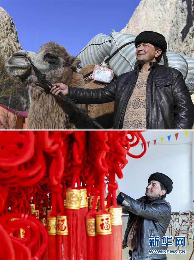 拼版照片上圖:都熱·加爾曼牽著馱有搬遷行李的駱駝走在喀喇昆侖山中(2018年11月17日攝);在塔什庫爾干塔吉克自治縣塔提庫力易地扶貧搬遷安置點的衛(wèi)星工廠,都熱·加爾曼在參觀由村民編制的手工藝品,他計劃讓妻子來這里上班(2018年11月18日攝)。2018年以來,新疆塔什庫爾干塔吉克自治縣對居住在艱苦偏遠山區(qū)、生產生活資料匱乏、難以實現(xiàn)就地脫貧的358戶貧困戶,陸續(xù)實施易地扶貧搬遷,搬遷至距縣城約25公里的塔提庫力易地扶貧搬遷安置點。安置點還開發(fā)了耕地、草場,建有衛(wèi)星工廠,確保像都熱一樣的貧困戶能穩(wěn)步增收脫貧。黨的十八大以來,我們堅持以人民為中心的發(fā)展思想,明確了到2020年我國現(xiàn)行標準下農村貧困人口實現(xiàn)脫貧、貧困縣全部摘帽、解決區(qū)域性整體貧困的目標任務。目前看,脫貧進度符合預期,成就舉世矚目。這些成績的取得,凝聚了全黨全國各族人民智慧和心血,是廣大干部群眾扎扎實實干出來的。脫貧摘帽不是終點,而是新生活、新奮斗的起點。新華社記者胡虎虎攝