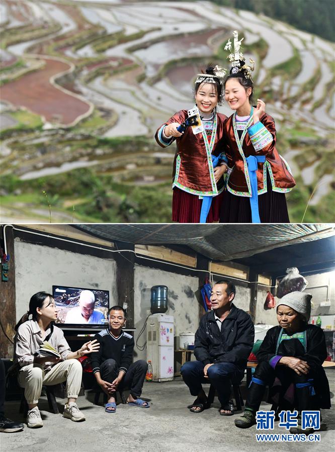 拼版照片上圖:吳賢艷(左)與村里的大一女生梁瓊英在直播推介加榜梯田風(fēng)光(4月19日攝);下圖:吳賢艷(左一)夜訪貧困戶(4月18日攝)。從江縣是貴州省深度貧困縣之一。1994年出生的從江縣侗族女孩吳賢艷在2017年大學(xué)畢業(yè)后回到月亮山區(qū)。2019年3月,她成為從江縣加榜鄉(xiāng)加車村脫貧攻堅指揮所的一名網(wǎng)格員。吳賢艷和其他駐村干部不僅會主動幫助缺少勞動力的農(nóng)戶,還利用閑暇時間通過網(wǎng)絡(luò)平臺,向山外推介美麗的加榜梯田和苗寨風(fēng)光,吸引更多的游客來旅游,為村民們脫貧增收出謀劃策。黨的十八大以來,我們堅持以人民為中心的發(fā)展思想,明確了到2020年我國現(xiàn)行標(biāo)準(zhǔn)下農(nóng)村貧困人口實現(xiàn)脫貧、貧困縣全部摘帽、解決區(qū)域性整體貧困的目標(biāo)任務(wù)。目前看,脫貧進(jìn)度符合預(yù)期,成就舉世矚目。這些成績的取得,凝聚了全黨全國各族人民智慧和心血,是廣大干部群眾扎扎實實干出來的。脫貧摘帽不是終點(diǎn),而是新生活、新奮斗的起點(diǎn)。新華社記者楊文斌攝